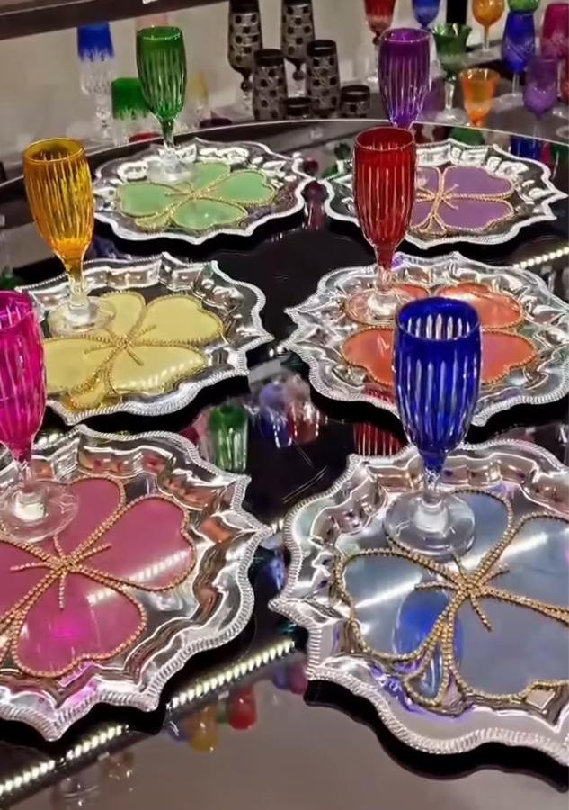 6 lı renkli el kesmesi bardak 6 lı renkli yonca peçete 6 lı çelik paslanmaz sunum tepsisi 18 parça set içerir