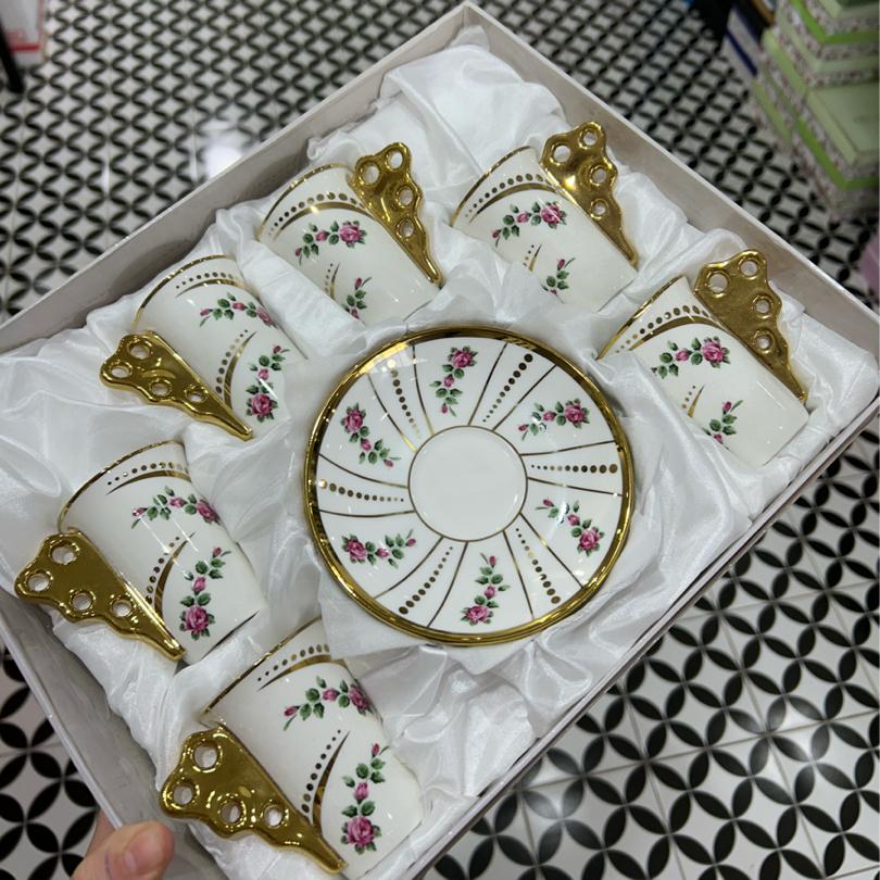 Pembe çiçekli gold Kuplu fincan takımı