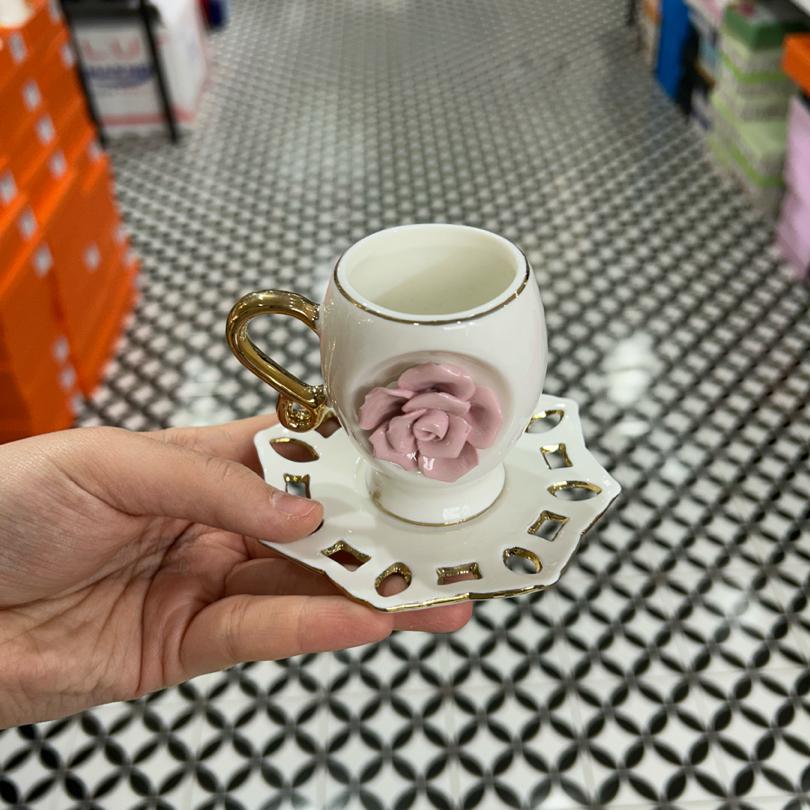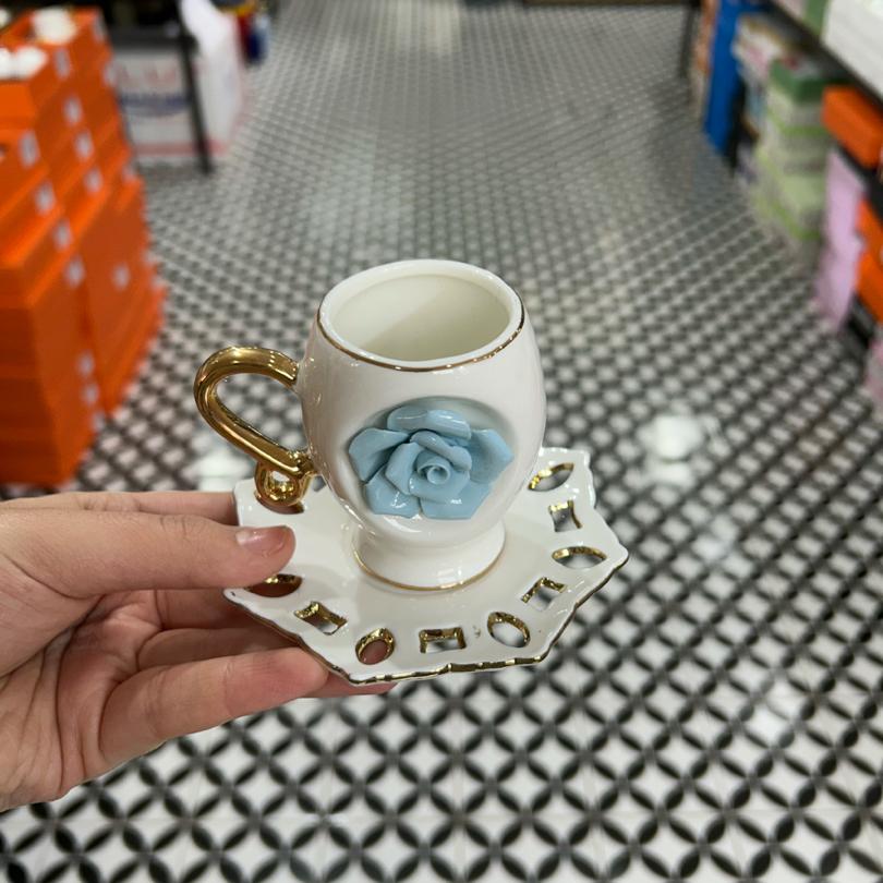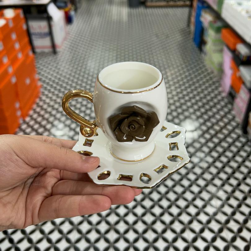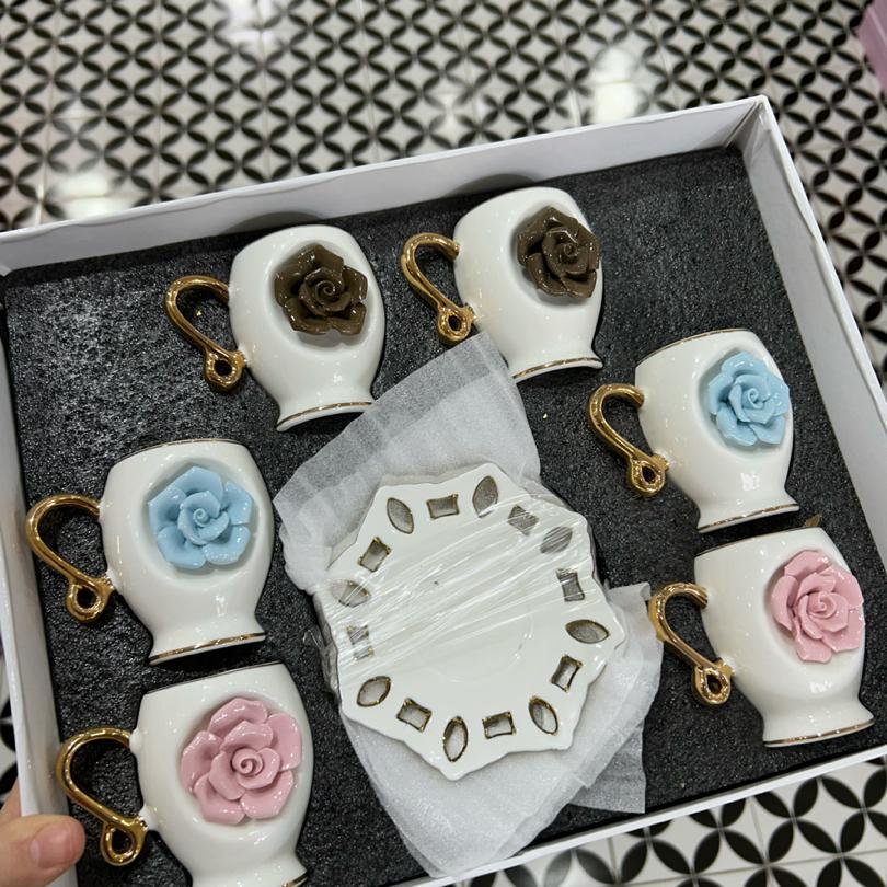 Üç renk kabartmalı güllü altılı fincan takımı